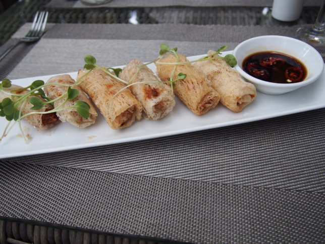 私が注文したのは、パッションフルーツジュースとベジタリアン向け揚げ春巻き。