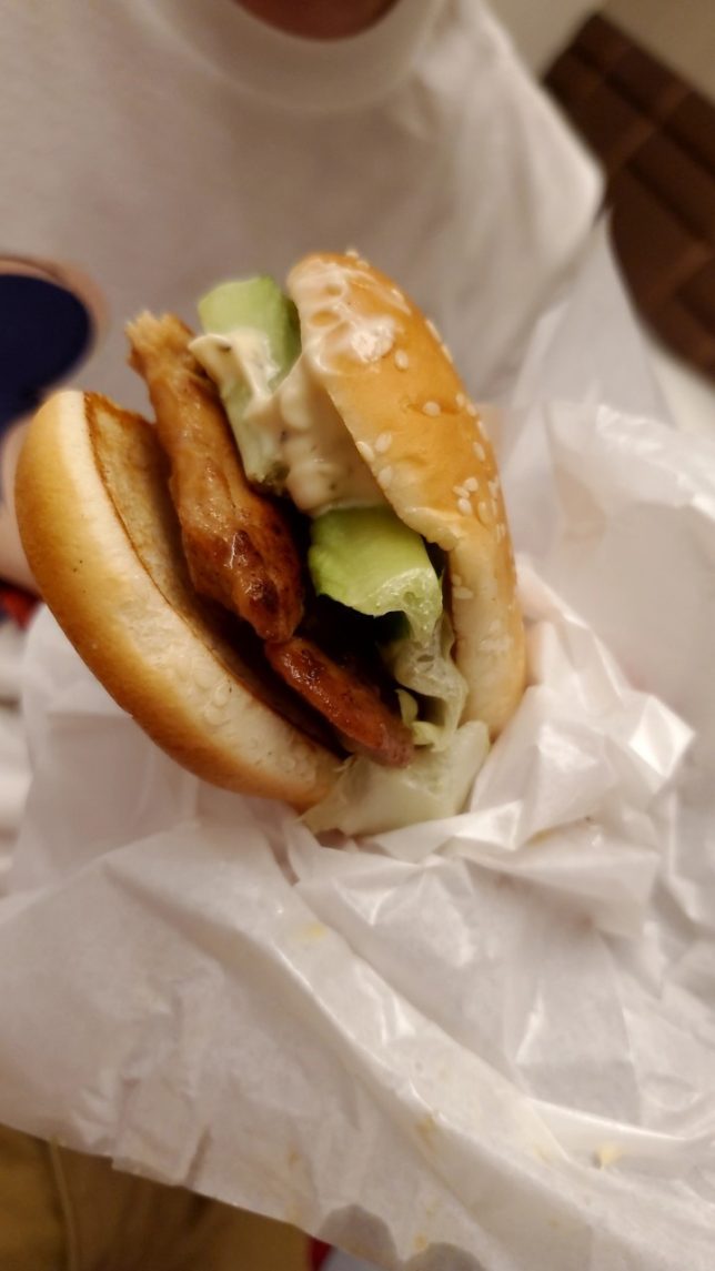 黒胡椒で味付けされた鶏のもも肉がはさんであっておいしいです。