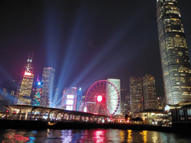 進行方向左側(九龍側)に座っていたんですが、逆サイド(香港島)の方がシンフォニーオブライツは派手でした。