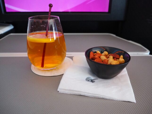 搭乗して離陸するまでの間にウェルカムドリンクとナッツのおつまみをいただきました。